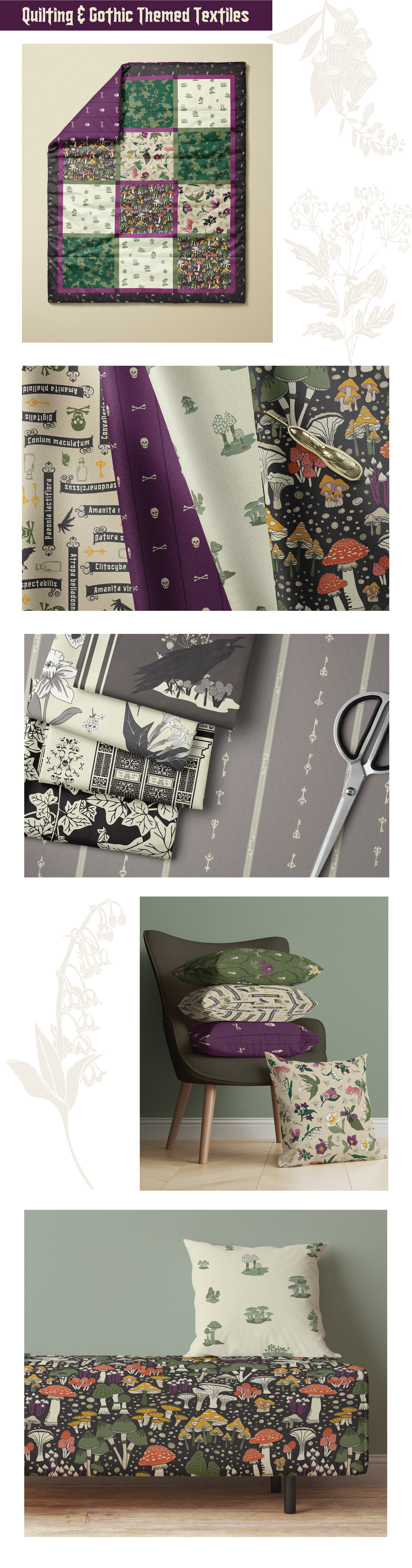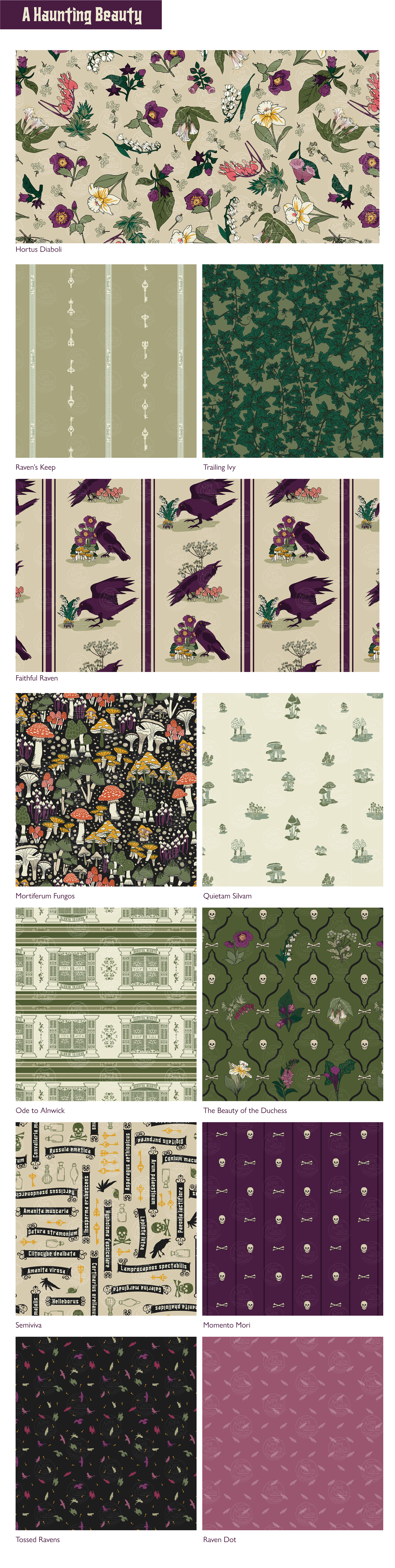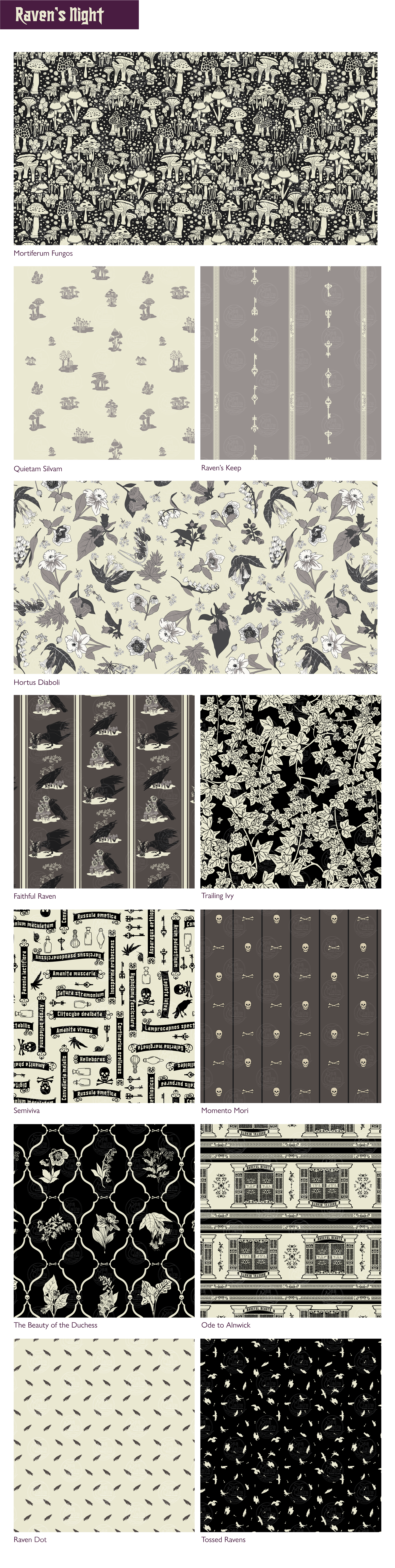 Many of these Gothic and Halloween-inspired surface pattern designs are also available on products found in our Etsy Store. Click the Etsy social media icon to go directly to the store.