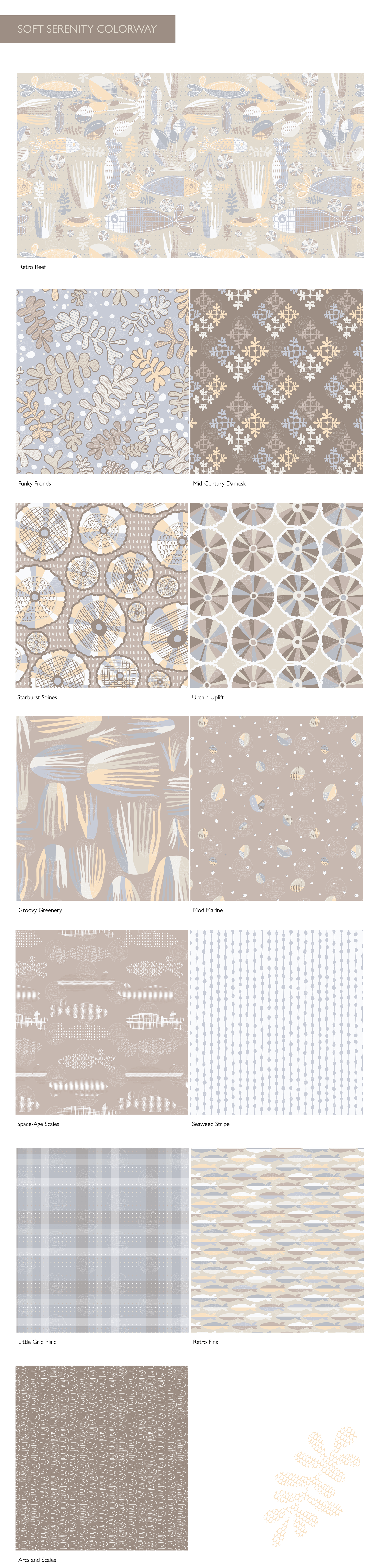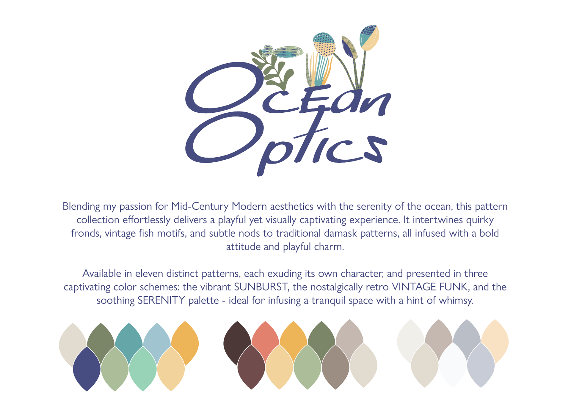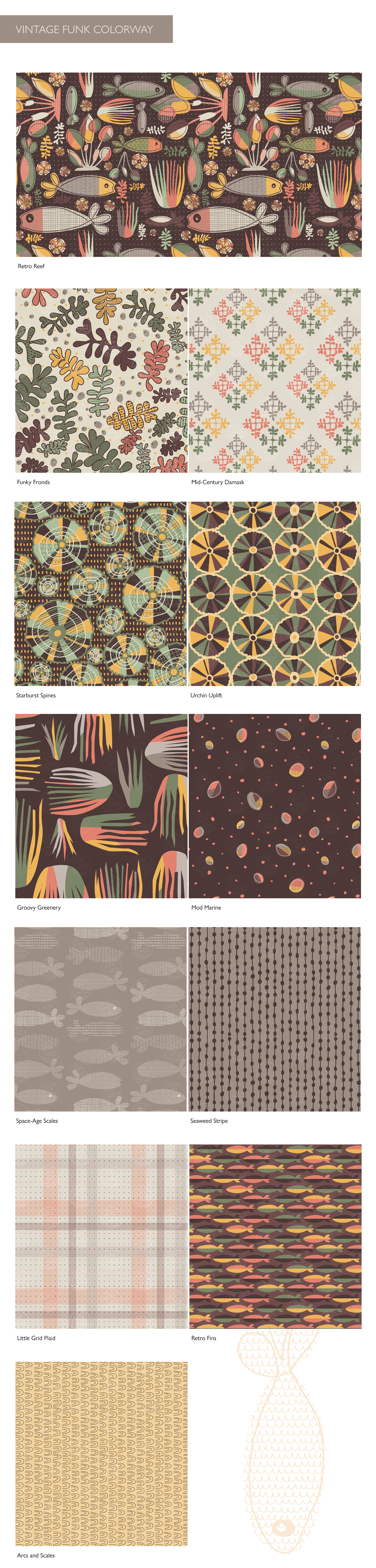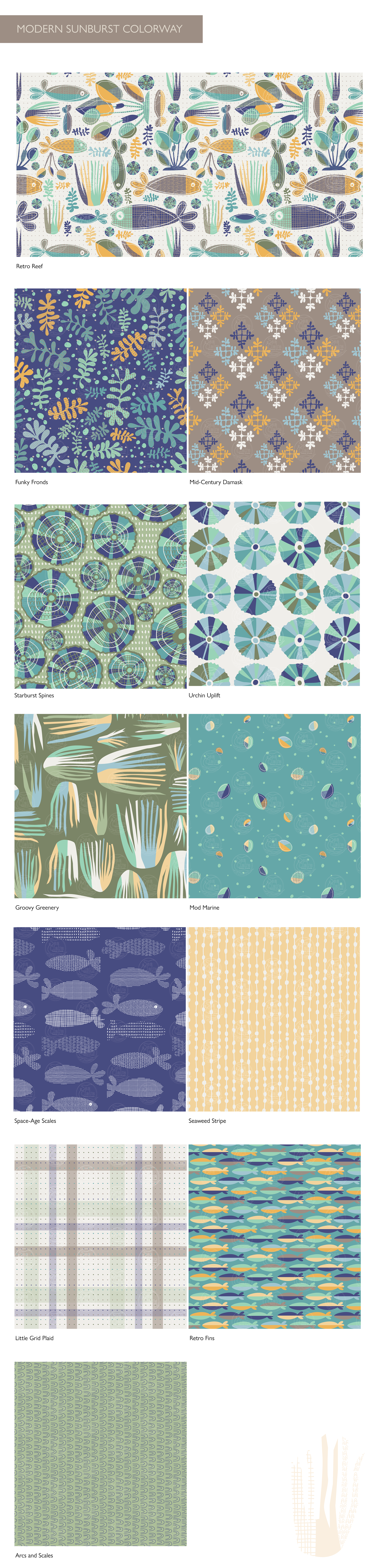 A surface pattern design collection for wallpapers, fabrics, and home textiles. Inspired by the beauty of the ocean and the fun of mid-century design.