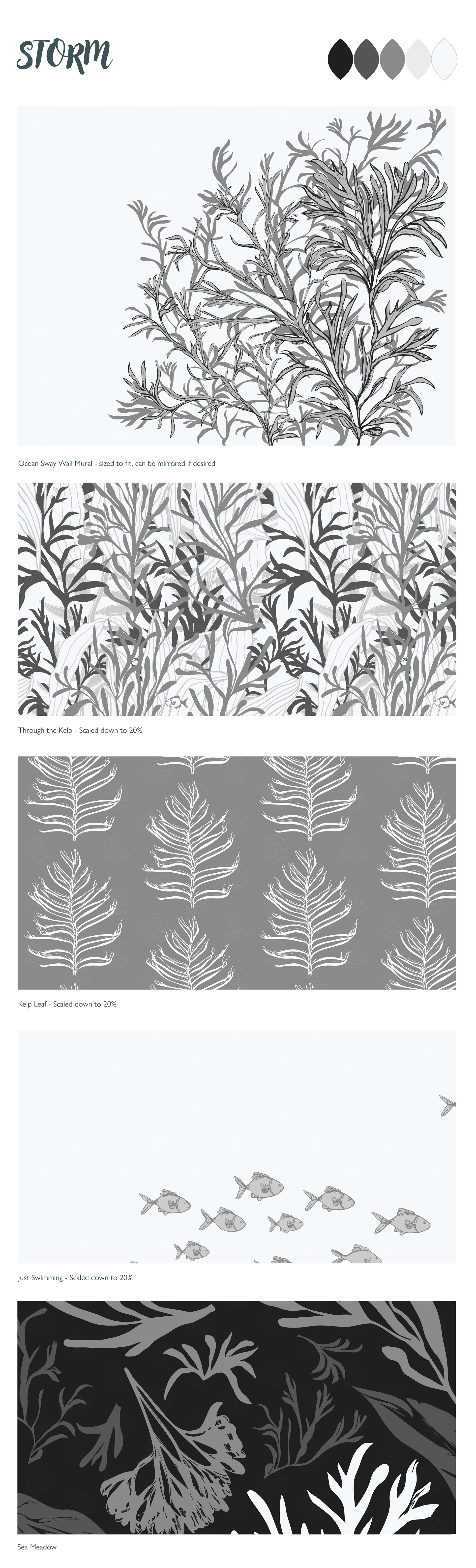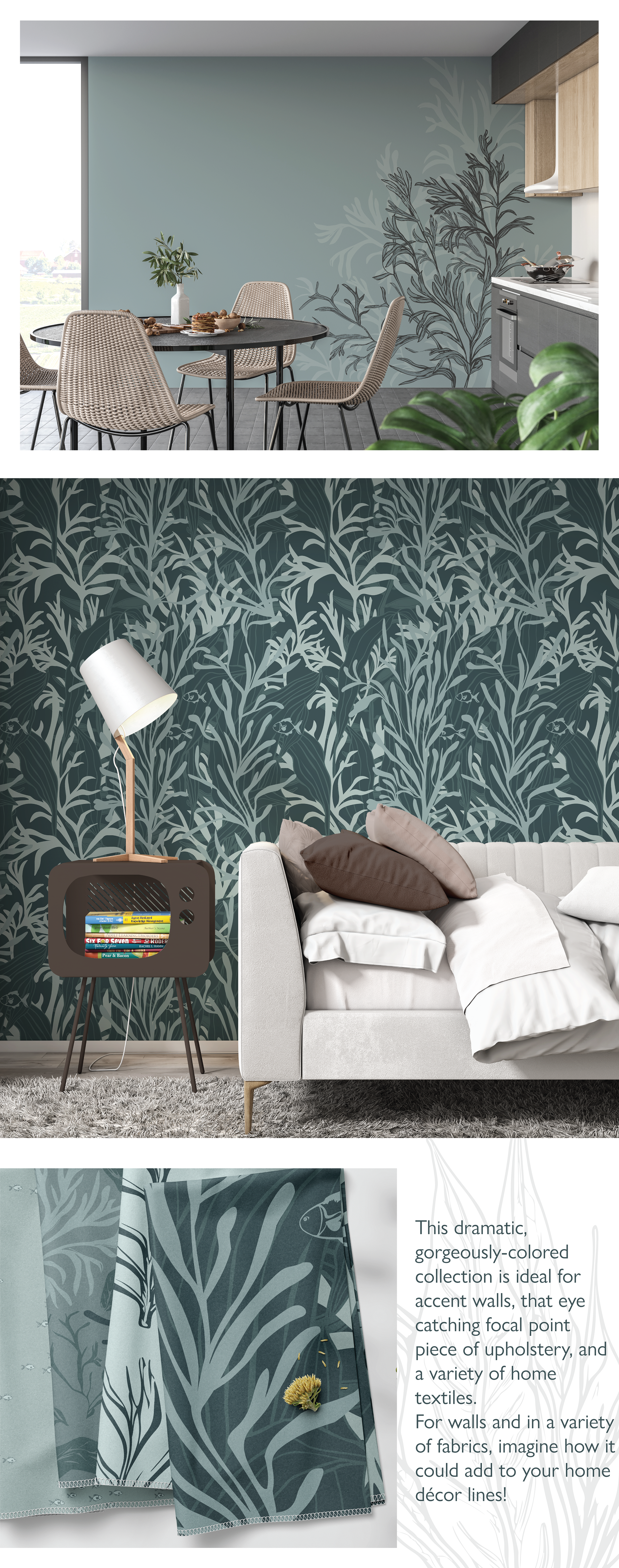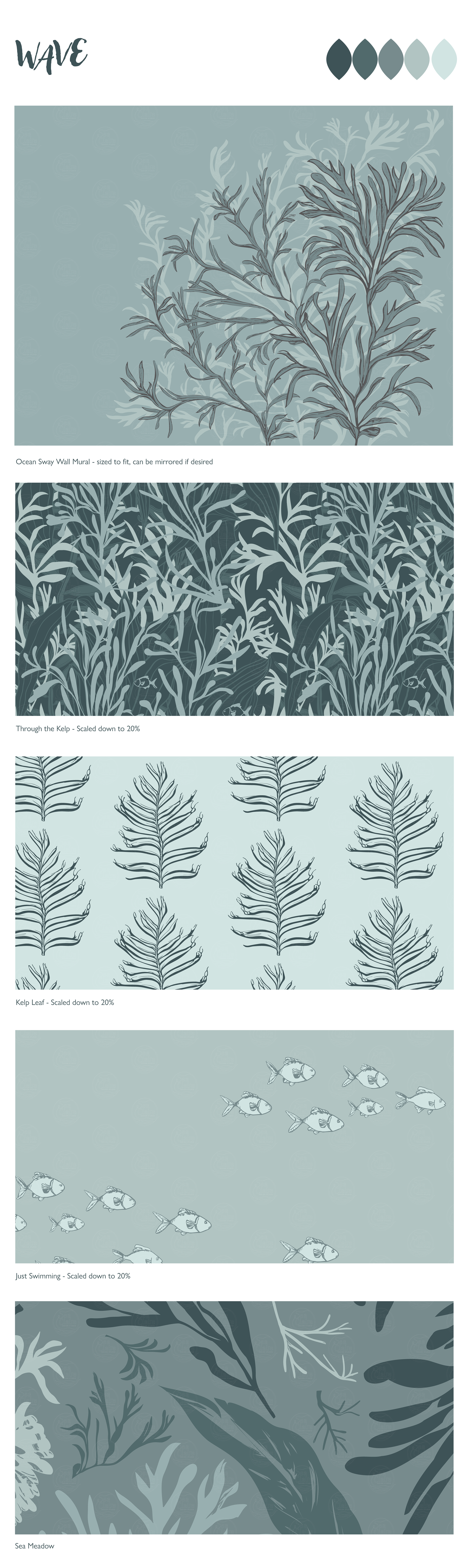 A surface pattern design collection for murals, wallpapers, fabrics, and home textiles. Inspired by the beauty and grace of the ocean.